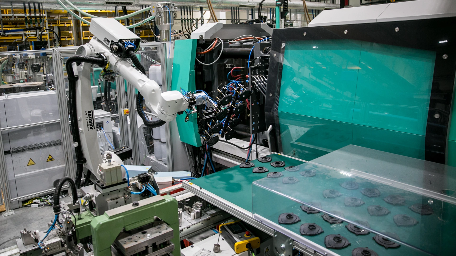 Integracja z wtryskarkami robotów kartezjańskich Multilift, Wittmann, Sepro oraz sześcioosiowych Kuka i Yaskawa wspierają obsługę odbioru detali, insertowania oraz operacji dodatkowych.